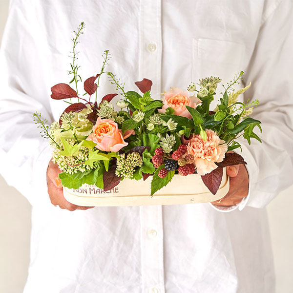 横長の安定した器にアレンジしますので、食卓や玄関など置く場所を選びません。花瓶いらずで安定感があるアレンジメントは、高齢の方や忙しく過ごす方へも嬉しい贈り物に。